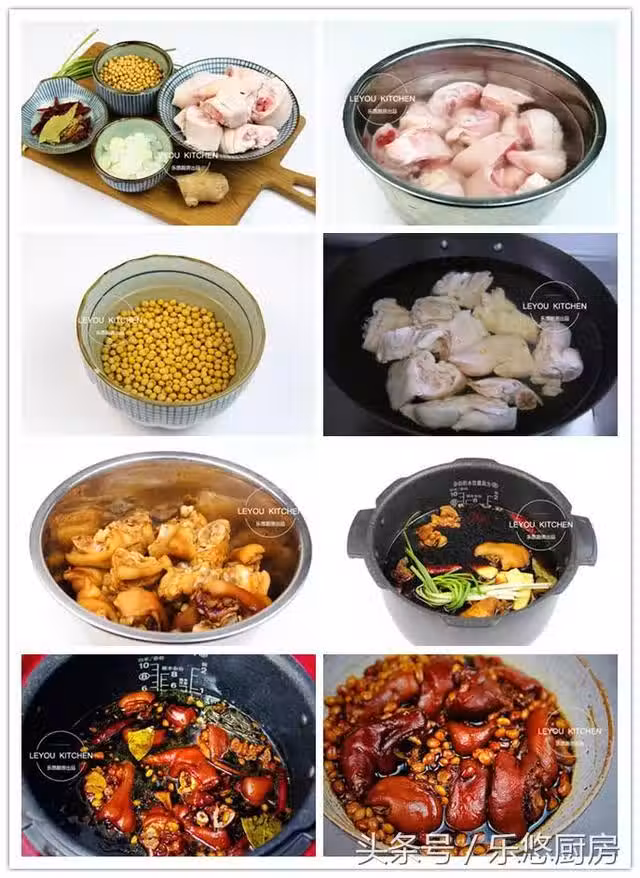 第六步:將豬蹄連帶醬油一起倒入電飯鍋中,再放入泡好的黃豆。然後放入冰糖、八角、桂皮、香蔥、薑片、香葉、花椒、干辣椒、3勺鹽、1碗清水,然後蓋好鍋蓋,燉煮1個小時,然後燜1個小時。(水的量沒過豬蹄就好。)