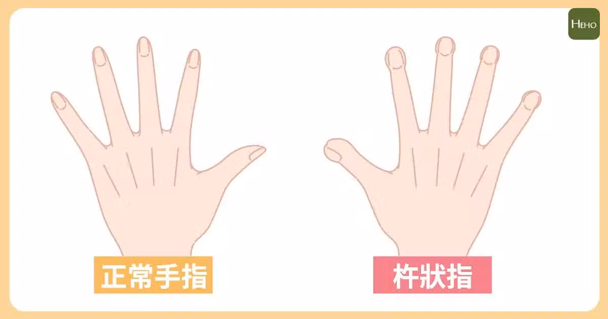 表現為手指或足趾末端增生、肥厚、呈杵狀膨大。其特點為末端指(趾)節明顯增寬增厚,指(趾)甲從根部到末端呈拱形隆起,使指(趾)端背面的皮膚與指(趾)甲所構成的基底角等於或大於180°。