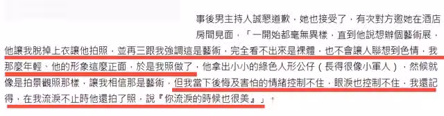 看對方不樂意,這位男主持人告知這並不是裸 照而是藝術,讓別人完全看不出來。 由於這位男主持人的形象太過剛正,加上在圈內的名氣很大,所以這位女網友就答應了他的要求,按照他說的去做了,拍完照後,這位女網友止不住流淚哭了出來。 這位男主持人繼續給她灌輸思想,表示,你流淚的時候也很美,雖然這件事過去了這麼多年,但一想到這句話她依然覺得很噁心。