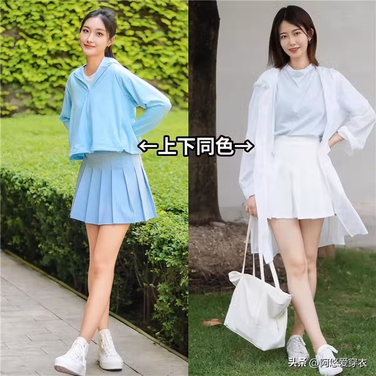 穿防曬衫還有搭配半身裙的時候要注意麵料質感,防曬衫雖然輕薄,但是也不能選擇料子太皺的款式,容易顯得廉價,選半身裙的時候也要選擇垂感向下的面料,比如說緞面或者是這種雪紡的材質,具有一定的量感,又不會太厚重,穿起來會向下拉伸腿長。