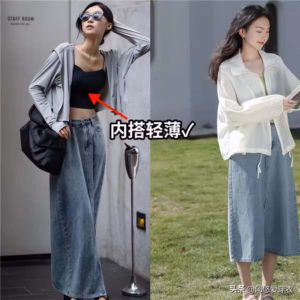 配色講究清爽,防曬衫和半身裙的顏色選擇也建議多選淺色,這樣穿在身上會顯得更加清新脫俗,降低整體造型的沉悶感。