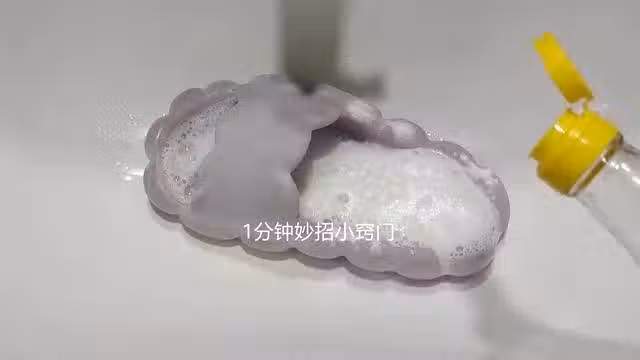 現在,我們拿一把鞋刷過來,進行刷洗,拖鞋上面有些污漬比較重的地方,我們可以多次重複刷洗。在刷洗的時候,我們可以看到拖鞋上面的一些頑固污垢,輕輕鬆鬆就把它給刷洗出來了,清潔的效果還是非常不錯的。用這個方法來清洗拖鞋,就可以快速把拖鞋給清洗乾淨了,而且清洗起來還非常輕鬆。