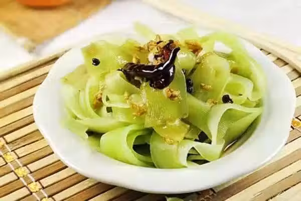 用料:萵筍300克,食鹽1小勺,白糖1小勺,紅尖椒3個,花椒1小勺,醋1小勺,生抽1小勺,蒜2瓣,植物油適量