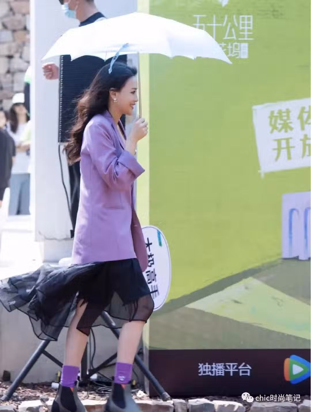 黑色輕紗連衣裙輕盈飄逸,搭配紫色薄款西裝外套,神秘而明艷,腳上的色彩搭配與身上如出一轍,紫色襪子配上黑色小皮鞋,摩登感get。再配上舒淇的大波浪卷髮,秒回90年代復古港星。