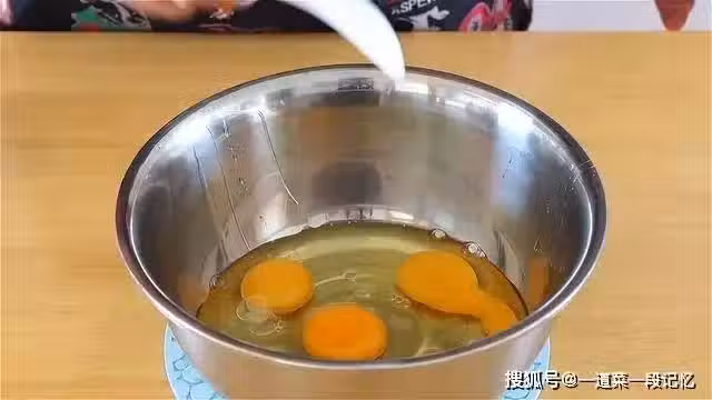 2.用打蛋器高速打發至看見細小的泡泡,加入白糖30克。(白糖量根據個人口味增減)