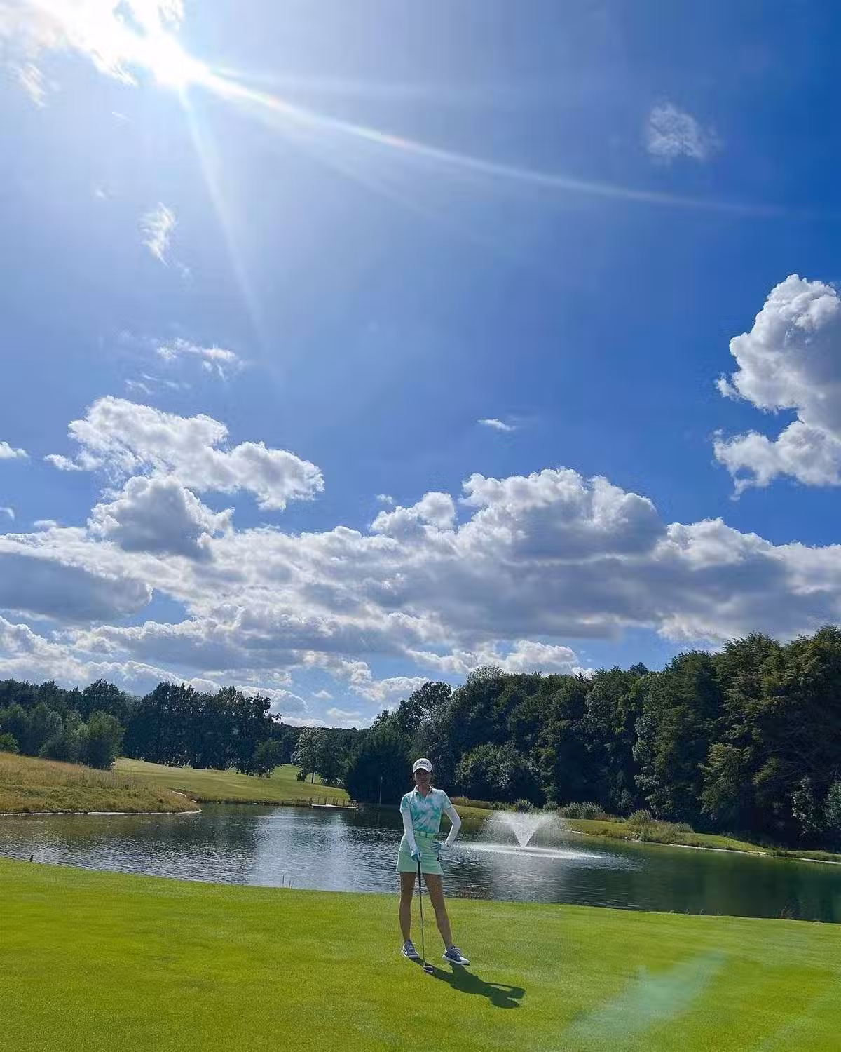 與好友相聚的她顯然特別開心,在一個風景秀麗的高爾夫球場上,她舉著球桿一連拍攝了好幾張照片,臉上始終洋溢著燦爛的笑容。