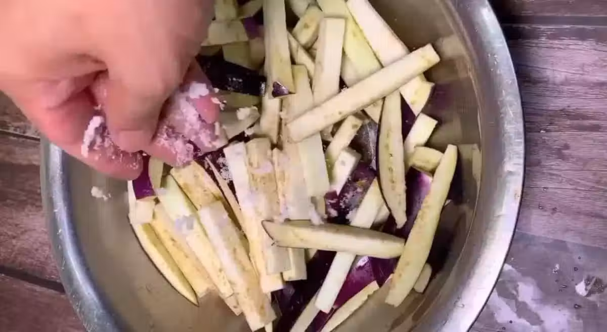 首先,準備幾個新鮮的茄子,清洗乾淨,把它們變成長條(或切成大塊),放入碗中,撒一點鹽,攪拌均勻,等待1-2分鐘,擠壓其中的水,放在一邊備用。