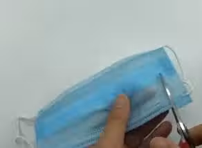 拿出一次性口罩,用剪刀將一次性口罩的一端剪開。