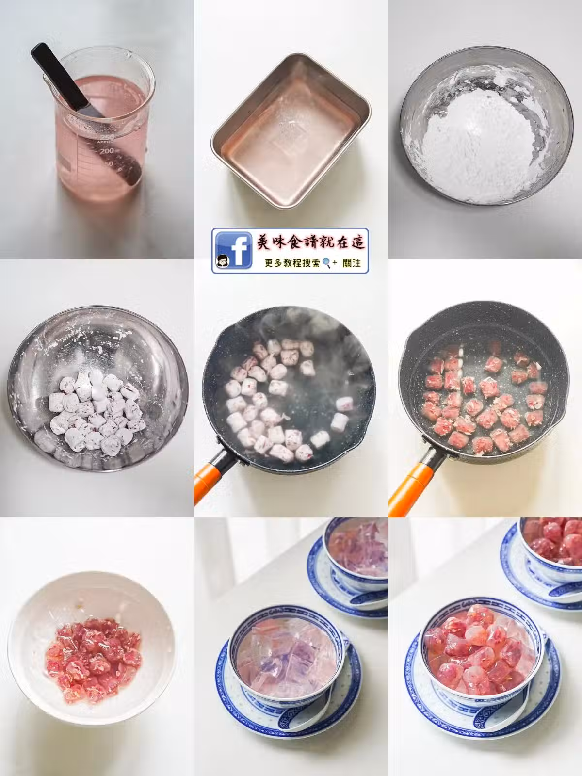 ▪️玫瑰花碎、玫瑰糖漿加入木薯澱粉中,倒入剛燒好的沸水,攪拌成絮狀。