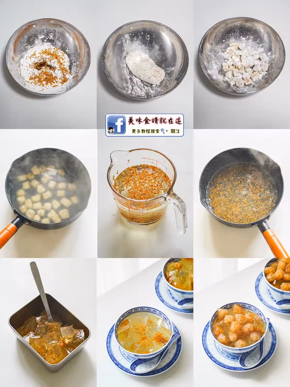 ▪️糖桂花、干桂花、蒟蒻粉加入直飲水,混合均勻後入鍋煮沸,倒入容器放涼。