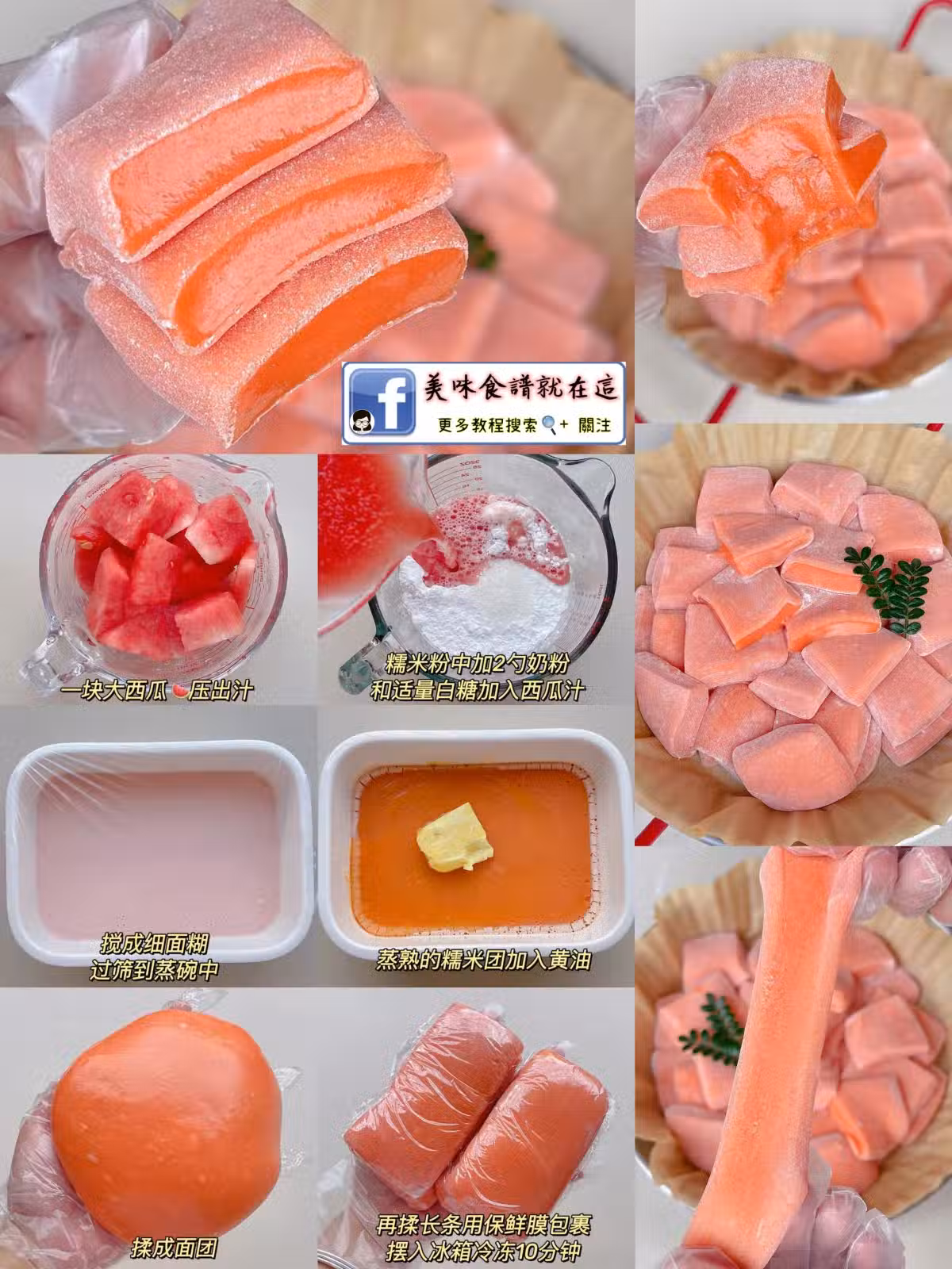 一大塊西瓜壓出汁過濾渣渣,糯米粉中加2勺奶粉少許白糖,倒入西瓜🍉汁攪成糊狀,蒸熟揉團再揉長條,用保鮮膜包裹擺冰箱冷凍10分鐘左右,切小塊