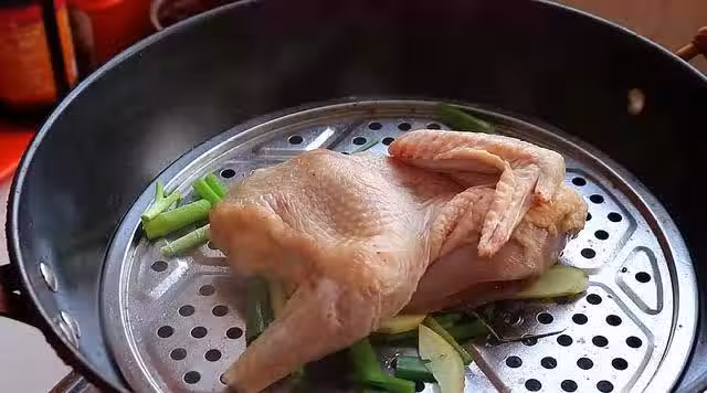 3、準備好的半隻雞浸泡好了之後,咱們把它撈出來控一下水分,然後把雞爪剁下來。提前燒一鍋開水,向開水中加入適量的料酒,然後放上蒸屜,再在蒸屜上放上剛剛切好的蔥段和薑片,要均勻,平整地鋪在蒸屜上。然後咱們把雞放到蔥段和生薑上,蓋上鍋蓋,用中火蒸25分鐘。