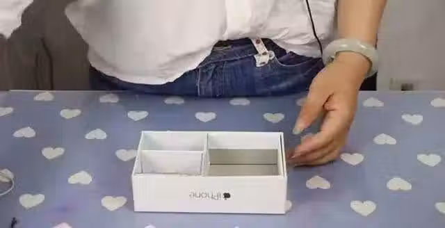 3.將這些小格子,按照圖中那樣,擺放到手機盒的蓋子中,這樣一個非常簡單的收納盒就完成了。
