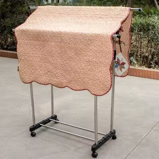這種升降衣架也很不錯哦,一般是固定在陽台頂上,對於陽台頂承重壓力較小的設計,可以採用落地式晾衣架。這款雙槓晾衣架可以掛置非常多的衣物,還能自由調整高度和長度,實用性極強,而且還有360度旋轉滑輪,滑輪上還有剎車輪滑,想走就會走。