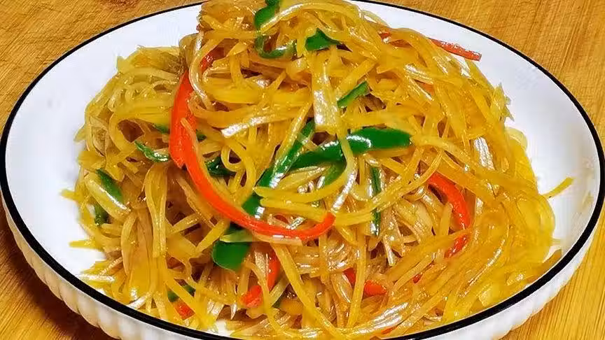 ②隨後熱鍋放油,倒入土豆絲,爆炒十幾下,再放食鹽、生抽、白醋、陳醋、澱粉水調味炒勻。