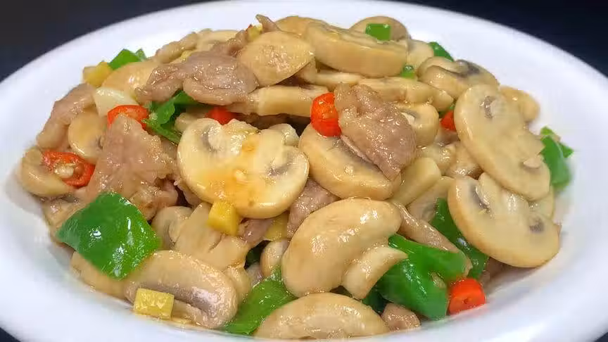 ②熱鍋放油,爆蒜香,倒入豬肉炒半熟。隨後倒入蘑菇、青椒炒勻,再放食鹽、澱粉水、雞精、少許生抽調味。