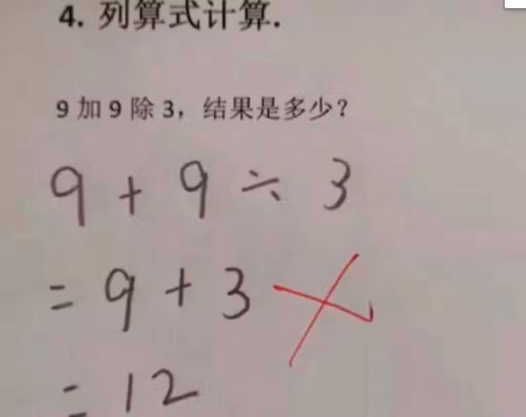 我兒子哪錯了?國小三年級數學題:「9+9÷3=12」被老師打叉!家長質問老師「反被打臉」:好好審題
