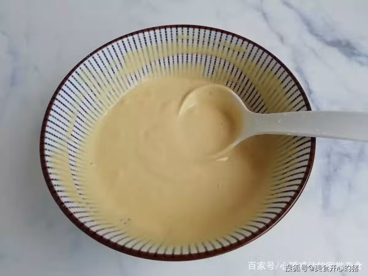 第五步:平底鍋加熱,如果粘鍋的話要刷點油,舀一勺麵糊,慢慢倒入鍋里,麵糊滴落以後,會自然形成一個圓餅狀。麵糊太稠就會很難成型,可以加一點點清水把麵糊再次攪拌均勻,太稀的話可以加一些奶粉或者麵粉進去。
