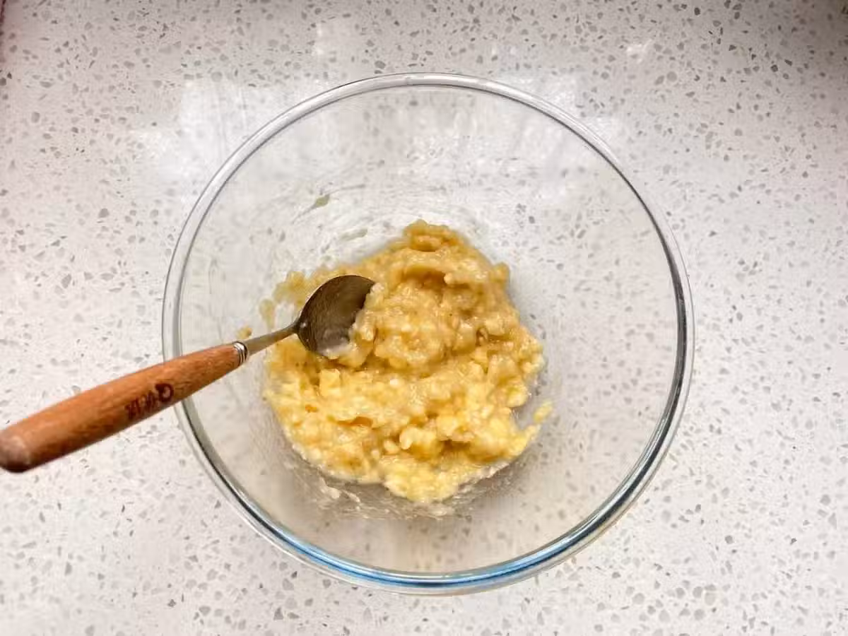 3、把雞蛋,玉米油,牛奶,還有希沙塘,全部都一起放進香蕉泥裡邊,再用手動打蛋器攪拌打發到細砂糖融化,將油脂和牛奶完全的融合在一起。