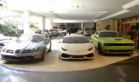 這三輛是奔馳SLR,蘭博基尼小牛,道奇SRT,雖然不是上千萬的車,但是性能都是野獸級別的! 這些車其實都停在一個專門的車庫中,這個車庫中有空調,以確保車子能夠在受天氣的影響。 這個車庫比較大,有專門的人員看護和維護,當然這個車庫一般人不能參觀的,當然這個車庫只能夠停他一個人的車,他父親也有一個私人車庫,裡面的車雖然沒他多,但是車都比他更豪華,更具有代表性!