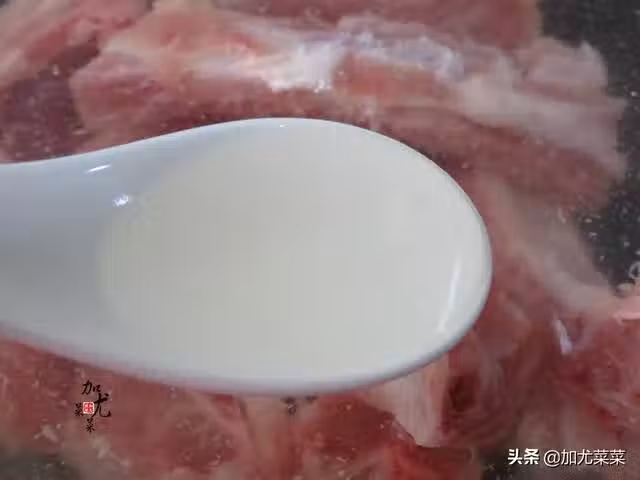 1、新鮮的排骨沖洗一遍,放入冷水中,倒入一勺白醋,將排骨浸泡半個小時再沖洗乾淨。加醋浸泡,排骨的肉質不發柴而且能起到殺菌的效果。