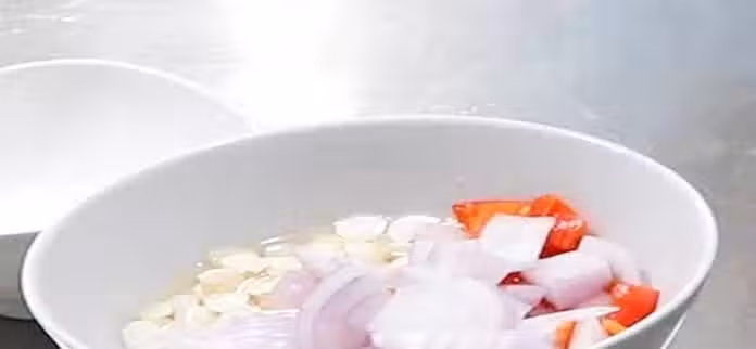 2.洋蔥半個切成小片,紅椒半個切成片,一起放入裝杏仁的碗中。