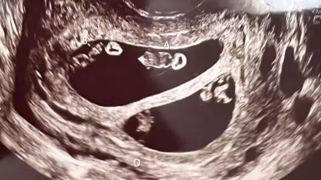 醫生在照超音波時發現驚人景象,艾希莉本來以為自己是懷著一對雙胞胎寶寶,沒想到醫生疑惑的看著螢幕好久,又走出房間請同事一起來觀察,最後才確定她竟然懷上了2對同卵雙胞胎,分別為2男2女,而醫師也解釋這狀況在醫學上發生機率僅7千萬分之一,根本就像是中了一張大樂透般不可思議!