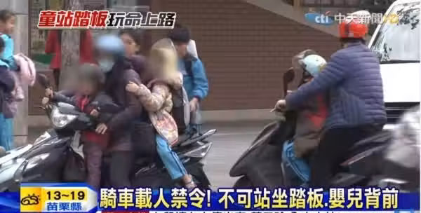 前踏板則不得載人;胸前背掛嬰兒騎車方式,以及在機車前後座加裝兒童椅背一樣違反交通規則。