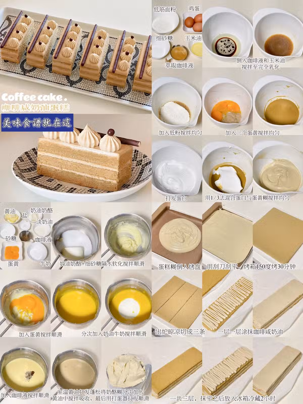 🤎🤎做好的咖啡奶油霜裝入裱花袋,剪小口擠在蛋糕面上,塗抹平整,一共疊三層,然後放冰箱冷藏2分鐘以上,取出後切塊,擠奶油花點綴裝飾就好了~