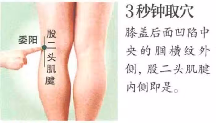 1.穴位位置:膝蓋後面凹陷中央的膕橫紋外側, 股二頭肌腱(腿窩外側可摸到一粗 大筋索) 內側即是。