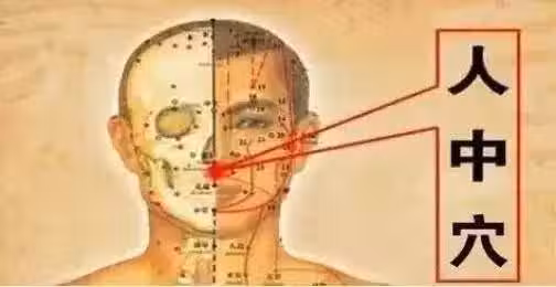 將手指或刮痧板角部放置在人中穴上,用連續點按該穴的方法點刺人中穴。人中是督脈穴位,點按它可以振奮陽氣,緩解痙攣。