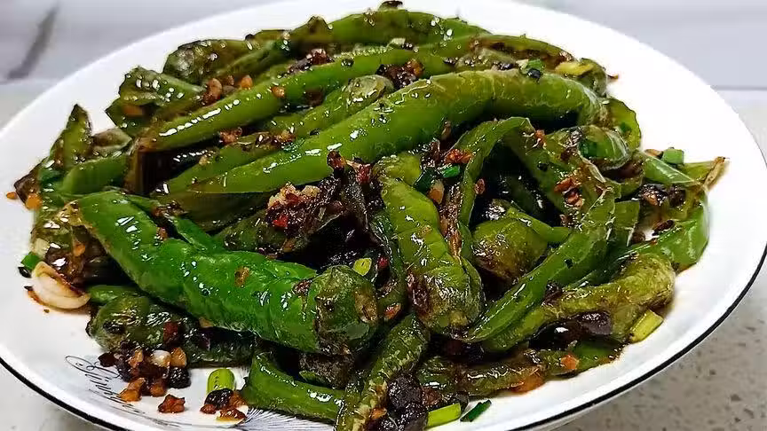 做法: ①選擇長條形的青椒,豎切去籽。 ②接著熱鍋不放油,放入青椒,用鐵鏟拍扁,煎到雙面虎皮色後撈起來。 ③繼續熱鍋放油,爆蒜香,放一把豆豉炒香,倒入青椒,放食鹽+生抽+少許澱粉水+蚝油調製的料汁,大火收汁,最後撒蔥花起鍋。 ④這道虎皮青椒,滿滿豆豉香味,青椒香軟入味,咸香爽口,越吃越好吃。