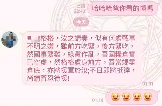 根據《東森新聞》報導,男大生先是「上奏摺」到家族Line群組,搞笑寫下「 父皇,戰況激烈,前線吃緊,幾近彈盡糧絕,孩兒在此請求父皇開倉賑糧,以國庫充天下,以解百姓燃眉之急,後世不然稱頌父皇豐功偉業,青史留名,孩兒竊以為此計可行,請父皇定奪。」,姐姐一看先是回「「這是在討零用錢嗎?」立刻破梗,讓原PO以為爸爸不會回覆了。
