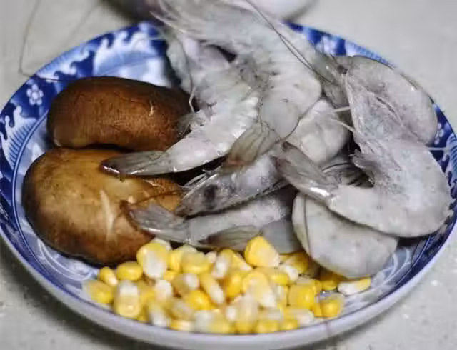 大米1杯、新鮮香菇2個、水果玉米粒少許、冰鮮蝦8隻、鹽少許、米酒汁幾滴、香蔥少許、香油幾滴、胡椒粉少許;