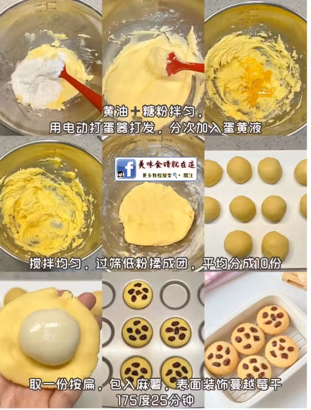 [三]過篩低粉泡打粉揉成團,同樣分成10份,取一份按扁,包入麻薯,表面裝飾蔓越莓,烤箱170度烤25分鐘左右。