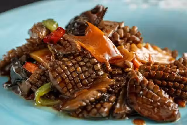 食材:豬腰子、韭菜、紅辣椒、泡椒、泡姜、蔥姜蒜、豆瓣醬、鹽、雞精、生抽、澱粉
