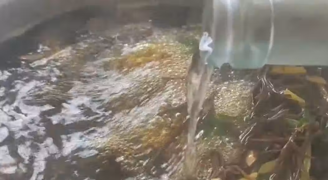 時間到我們打開蓋子看一下,非常濃郁的艾草生薑香味撲鼻而來,鍋里的水已經變成了深褐色,說明艾草、生薑的成分已經被激發出來,然後我們再往裡面加入適量的高度白酒,用勺子攪拌均。