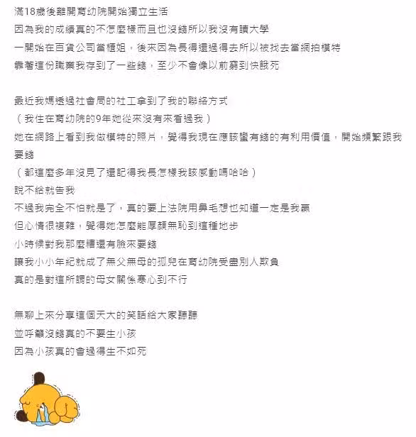 媽媽有躁鬱症,常對我拳打腳踢,沉迷網路交友、不去工作,家裡窮到沒錢吃飯...我9歲就被送到育幼院,成年後靠當櫃姐、接網拍,終於存了點錢,結果生母突然找上門「討要孝親費」,還說不給就告我,我該怎麼做...