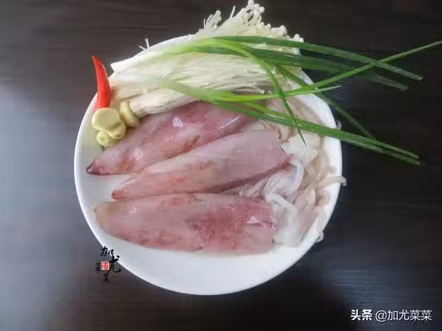 魷魚,金針菇,大蒜,香蔥,小米椒,食鹽,澱粉,料酒,花生油,醬油