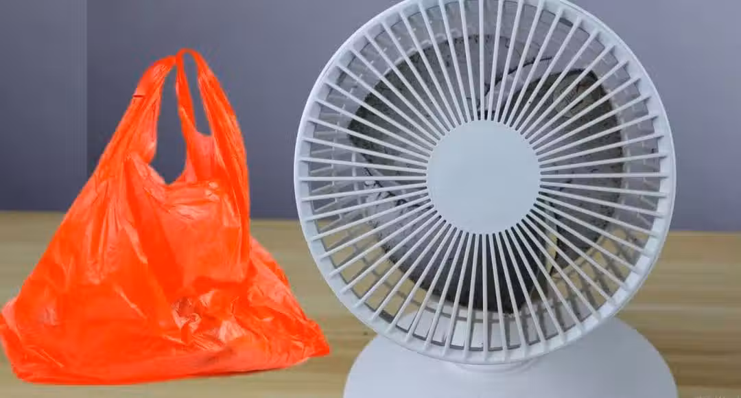 這樣做是因為電風扇的離心力能夠將扇葉上面的污垢自動甩出來,而套了塑料袋後,甩出來的污漬就不會弄得到處都是,弄臟我們的環境。