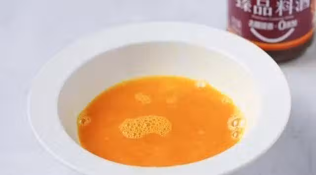 4.加熱鍋中的油,倒入雞蛋液,等待直到雞蛋液開始凝固,將雞蛋煎炸並握住以備使用。