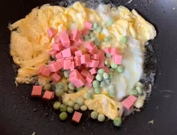 3、把米飯也倒進鍋裡面炒散,米飯建議大家就準備剩米飯就好了,剩米飯粒粒分明,炒出來的效果好,吃起來也有口感,剛蒸出來的米飯是黏黏的,不適合來做炒飯。家裡面沒有剩米飯的可以把蒸好的米飯取出來,晾涼就可以了。