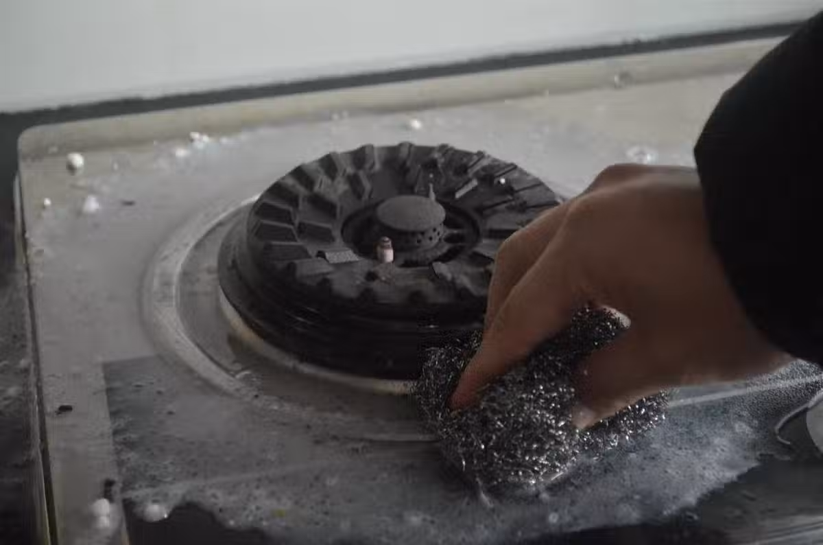 接著準備一個鋼絲球或者百潔布擦拭灶台的台面。我們在擦洗的過程中可以很明顯地看到灶台上面的一些頑固污漬立馬消失不見了。這是因為食用小蘇打和洗潔精都有很強的去污效果。其次,白醋也能軟化灶台上面的頑固污漬。食鹽除了能殺菌,而且它還是顆粒狀的可以增加摩擦力去除灶台上面的污漬。這四樣東西雙管齊下就能輕松去除灶台上面的污垢了。
