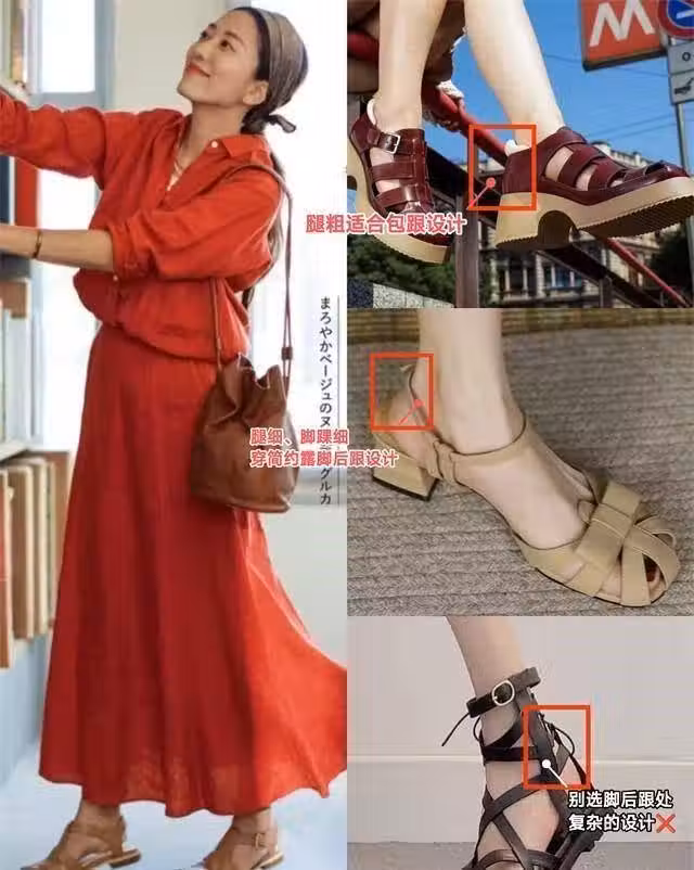 如果你屬於腳踝比較粗的類型,那就可以嘗試一下「包跟設計」的款式。但若是你屬於腳踝比較細的類型,那就大可選擇「細綁帶設計」的露後跟款涼鞋,不僅可以凸顯出纖細的腳踝,還能打造出更加舒適的效果。