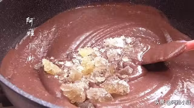 4.冰糖融化再加40g食用油,不停攪拌,讓豆沙把油全部吸收,隨著水分的蒸發豆沙慢慢就變濃稠了,顏色也越來越深。