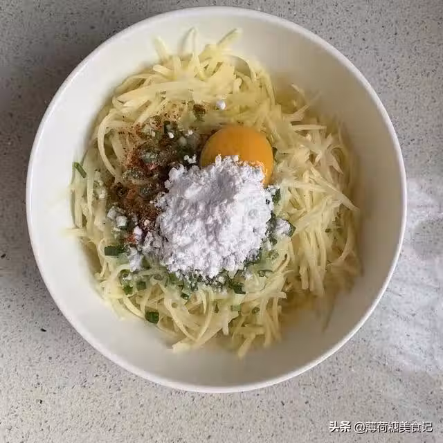 3,料理鍋中放些少許油,舀一勺洋芋絲,順便用勺子壓扁攤平,再用筷子把周圍零散的撥進去,把它整成圓餅狀。