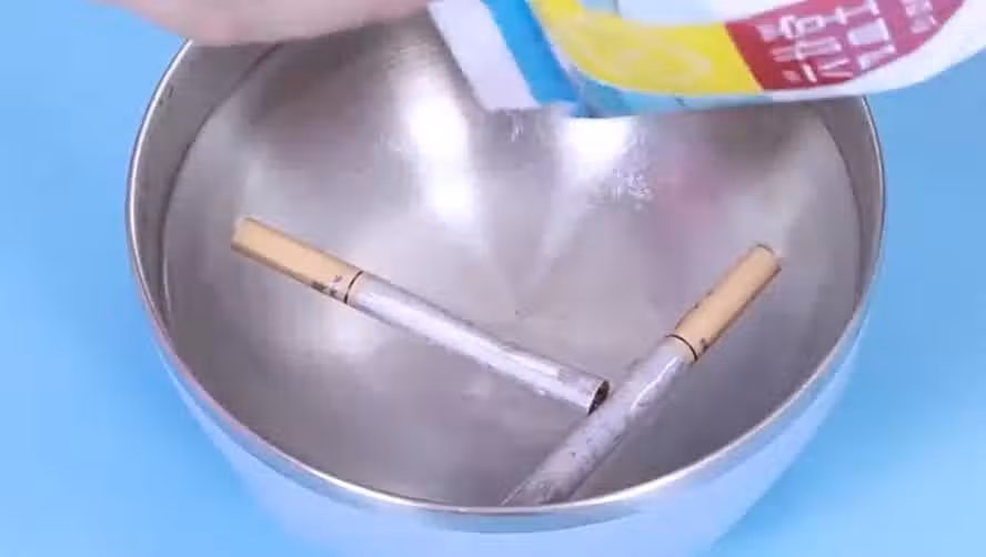 第四個用途,清潔灶台油煙機。準備一盆溫水,將家裡的香菸給它扔進去,然後在裡面加入食鹽,食鹽可以多加一些哦,接下來,我們給它攪拌均勻,讓它們浸泡十分鐘哦。
