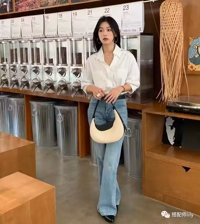 可以單穿,也可以進行疊穿,就是在裡面加上一件小背心,超好看的喲~下裝搭配一條牛仔微喇褲,這種褲型,穿起來可是很顯女人味的,對小腿粗的身材特別友好,有些拖地的長度,一點也不壓個子,只要適當提高腰線比例後,腿部線條就被拉長很多。