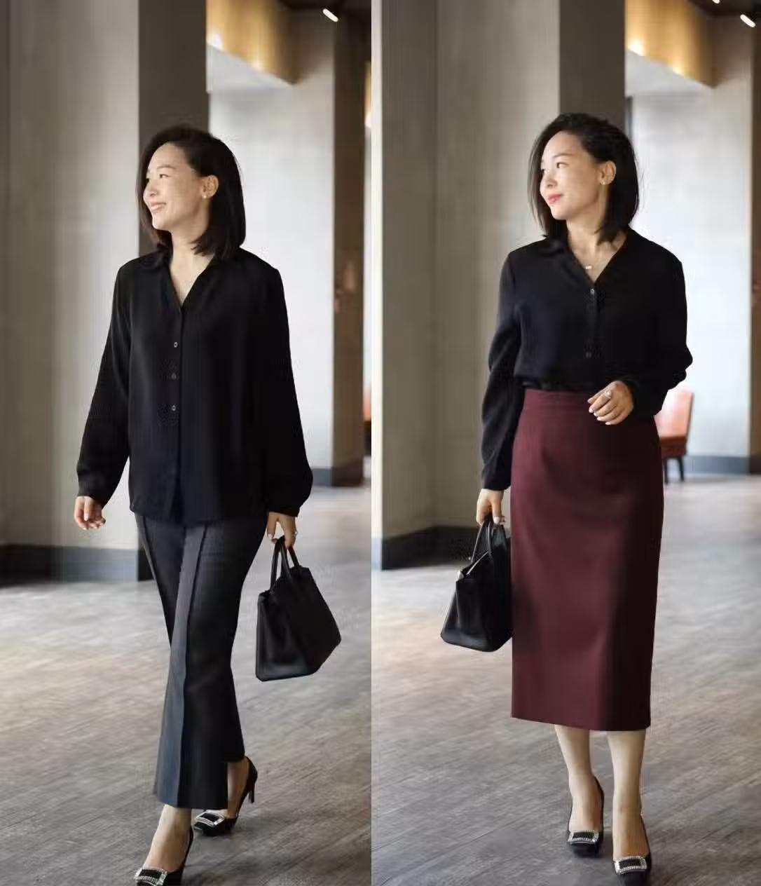 深色襯衫,可以將女性氣質呈現出更穩重的感覺,而配合同樣是深色的下裝時,整體疏離冷颯的風格也會越加增強。