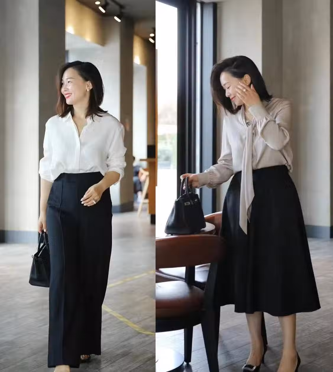 很多氣質比較成熟大氣的女性,她們的衣櫃中往往不會缺少深色襯衫,版型寬大的黑襯衫,在上半身留足了空間感,便於適配不同的體型。但會搭配的女性,一般都會將衣角塞在下裝中,這樣才能更顯高顯瘦。